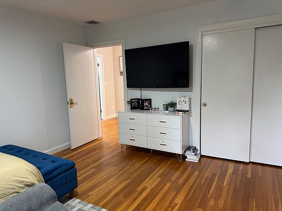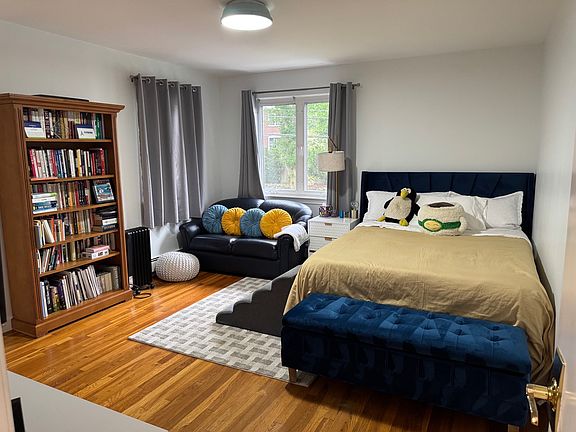 #2-Blue-Bedroom (about ~15'x13')-This room is part of the upper level of a single family residence cross the Beacon Street from Boston College Stadium. The upper level has 4 bedrooms and 2 bath. This room is part of the upper level of a single family residence cross the Beacon Street from Boston College Stadium. The upstairs has central AC and Cooling. Kitchen and sunroom have additional 2 mini splits that provide heating and cooling. This unit has 2 screened windows (south/south west facing windows that bring in the light. Blackout curtains allow you to sleep in. Hardwood floor makes cleaning easy. This room shares a newly renovated full bath down the hall, 2 separate storage closets. This unit also shares an eat in kitchen with sky light, a dining room that sits 8+ people and a living room. Sitting on a modern glass TV stand is the 55" TV with smart TV functionalities provided by Amazon Fire Stick. Kitchen, Dining and Living room have many recess lights that provide ample lighting. Sitting in the back is a sunroom with in unit washer/dryer and year around heating and cooling. This unit has a lot of common space for you to study, work, eat, relax and socialize with friends. Parking spots are also available for rent separately. 12