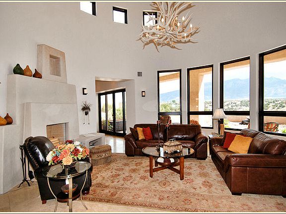 You will never want to leave your backyard with these incredible Sandia mountain views! This gorgeous Placitas dream home is just minutes away from the interstate but also feels private once you enter the secluded court yard. The massive great room is open to the kitchen for the perfect setup for entertaining. Formal dining area is an added bonus! Large windows bring the beautiful views inside. Master suite is on main level with a kiva fireplace, spacious bathroom and tons of room in the walk-in closet. Upstairs you will find two large bedrooms with full on-suite bathrooms. Perfect for your family or visiting guests. Don't miss out on this opportunity to own the perfect Placitas getaway!