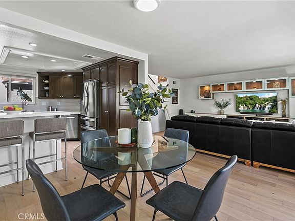 Location, Location, Location! This gorgeous townhome sits in the heart of South OC....just minutes to Laguna Beach, the Spectrum and Aliso Town Center...PLUS is walking distance to Laguna Hills Community Center and Laguna Hills High School AND next to the fantastic South OC biking and walking trail system. Move in to this immaculate, TURNKEY home and start living the good life...no weekend warrior projects needed here! You'll love the contemporary vibe with wide plank, REAL HARDWOOD flooring throughout and stylish built-in cabinetry. The designer made all of the right choices here...including modern kitchen with loads of cabinets in rich color tones, beautiful quartz counters and porcelain backsplash. PLUS every chef will enjoy a window at the sink! Convenient breakfast bar is the perfect spot for quick meals or "monitoring" homework. Large slider to the rear yard creates a perfect So Cal, indoor/outdoor lifestyle...and the outdoor space is just right for sunning, BBQ's and pets. Upstairs you'll find three spacious bedrooms all with high, volume ceilings... including a primary suite with room for king size bed, separate dressing area with dual wardrobe closets, and lovely remodeled bath. The additional bedrooms are adjacent to beautiful bath with deep soaking tub. Great upgrades here include contemporary paint palette, stainless accents, dual pane windows, cool A/C, epoxy garage floor and more! This is a MUST-SEE home that will check all of the boxes on your house-hunting list!