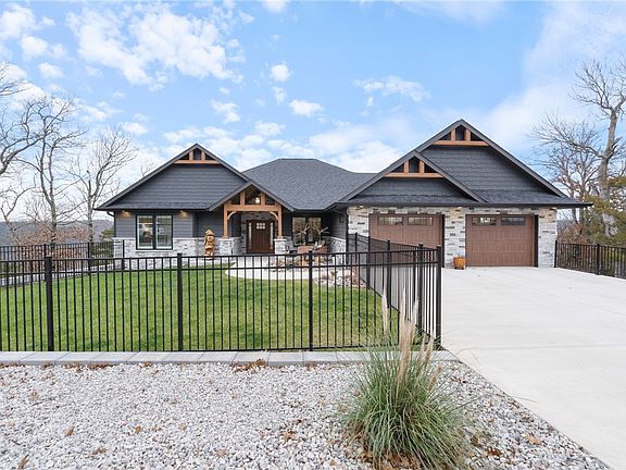 Experience this custom-built mountain craftsman lodge with jaw-dropping view of Holiday Island & Table Rock Lake. This one-of-a-kind home offers an open, split floor plan with 2 bedrooms, 2 bathrooms, & a versatile flex space off the foyer—ideal as an office, arts/crafts room, or library. The chef's kitchen features quartzite countertops, a 36" gas cooktop, wine cooler, walk-in pantry, & custom cabinetry. An expansive island & open-concept design flow seamlessly into the living room perfect for entertaining. Wood-tone luxury vinyl plank flooring, plantation shutters, & a gas fire place with a live-edge walnut mantel enhance the inviting atmosphere. Enjoy unparalleled views from the all-season sunroom, screened deck with pull-down shades, or open deck for stunning sunsets. Other highlights include spa like ensuite bathrooms, a 3-car garage, Elfa closet systems, a 24k whole-house generator, a fenced yard with irrigation, plus an approximately 2500 sq ft unfinished lower level ready for your personal touches.