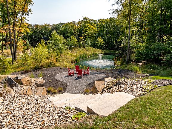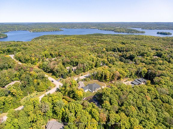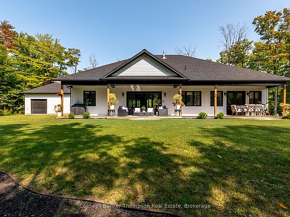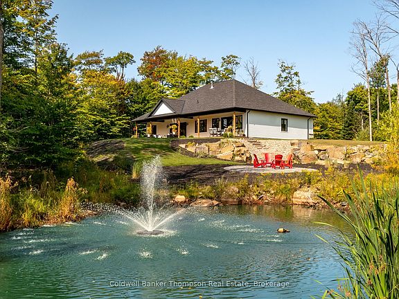 Welcome to this sprawling executive bungalow in the highly desirable Woodland Heights community. Here, thoughtful design, refined finishes, and serene surroundings create an exceptional home. Beautiful curb appeal sets the tone. The home opens into a spacious foyer that flows seamlessly into the open-concept living, dining, and kitchen areas. The living room is anchored by a striking propane fireplace. Pale oak hardwood flooring carries a warm, timeless feel throughout. The chefs kitchen is a true centerpiece. It features a huge island, integrated appliances with cabinet fronts, and a professional 6-burner propane stove. A well-planned servery offers abundant storage, a beverage fridge, and hidden prep space. This makes entertaining effortless. From the living room, sliding doors lead out to a covered deck with tranquil views of two ponds and the surrounding forest. This creates a perfect extension of the living space. Down the hall, discover four generously sized bedrooms, including a luxurious primary suite with a huge walk-in closet. The spa-inspired 5-piece ensuite boasts a soaker tub, glass shower, double-sink vanity, private water closet, and heated floors. The three guest bedrooms share a beautiful 5-piece bath with double sinks, heated floors, and has ensuite privileges to one of the bedrooms. A stylish 2-piece powder room adds convenience. On the opposite side of the home, a spacious laundry area with a sink doubles as a mudroom with inside access from the triple car garage. This slab-on-grade home offers nearly 3,000 sq ft of thoughtfully designed living space with soaring ceilings and abundant natural light. The result is a modern yet welcoming atmosphere. Set on over two acres of land, there is ample parking and space to enjoy. The homes design and décor reflect a perfect balance of sophistication and comfort. This is a rare offering in an established community. The property blends executive living with the peace and beauty of Muskoka.