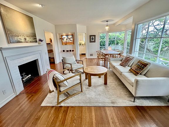 Step into a light-filled open floor plan that was tastefully remodeled, and is surrounded by lush gardens and trees. The updated kitchen, complete with high-end appliances, opens to a light filled living and dining area with coastal-chic furnishings and door leading to a private patio ideal for grilling and outdoor dining.