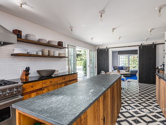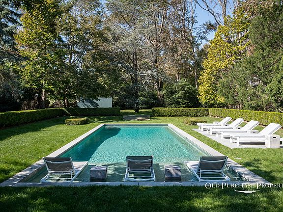 Drive up the 165 foot driveway to this wonderful Bellport Village South, move-in ready home, featured on the cover of September 2020 issue of House Beautiful magazine. Proceed to entry hall showcasing a modern cantilevered staircase by Marretti. This leads to an exquisite formal living room, with two-story cathedral ceilings, wood burning fireplace, and large windows flooding the room with natural light. A wall of French doors lead to an expansive deck with outdoor seating and a fire pit. The formal dining room with walls hand painted by Shantell Martin has direct access to eat-in kitchen with top of the line appliances, Viking stove, and dishwasher, Sub Zero refrigerator, and soapstone counter tops. The kitchen also features an eating area and a wet bar with open shelving and a wine refrigerator. Adjacent to kitchen is a cozy den/media room. A laundry room with sink and a first-floor half bath complete the downstairs. The second floor features a mezzanine overlooking the living room. A light filled main en-suite provides access to a balcony with seating area boasting sweeping views of Bellport Golf Course. The stunning primary retreat features two walk in closets, vaulted ceilings, bath with a large shower and custom cabinetry throughout. An en-suite guest bedroom with pool views completes this wing. A separate staircase leads to two additional guest bedrooms with en-suite baths. There is a full basement, and an attached 2-car garage. The property includes a charming year-round guest cottage with a bedroom, bath, kitchen and living area. Outdoor living offers a 16' x 48' gunite, heated, salt water pool, custom built hot tub, and an additional deck off the kitchen providing ample space for entertaining. Enjoy complete seclusion just moments away from the Village center for shopping and dining, marina with access to Ho Hum Beach on Fire Island, and country club for golf and tennis. All this on 1 acre of professionally landscaped property with no detail overlooked.