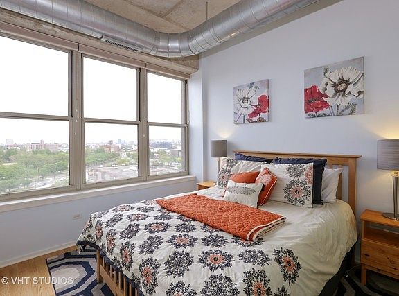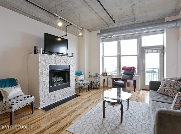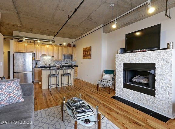 2 bedroom/1.5 bath loft style condo in hot West Loop! This light and bright corner unit features a balcony off the living room with skyline views. There are 10 foot ceilings and hardwood floors throughout. Living room has a gas fireplace with a stone surround. Kitchen features stainless steel appliances and a large island. Master bedroom is enclosed and has a large walk in closet and master bath. 2nd bedroom is lofted. LG full size washer/dryer. Building has door staff and onsite engineer. Garage parking and separate storage included. Great West Loop location!