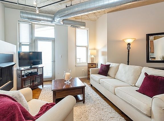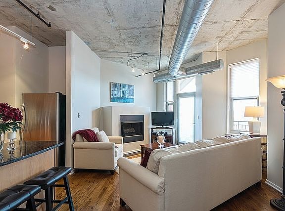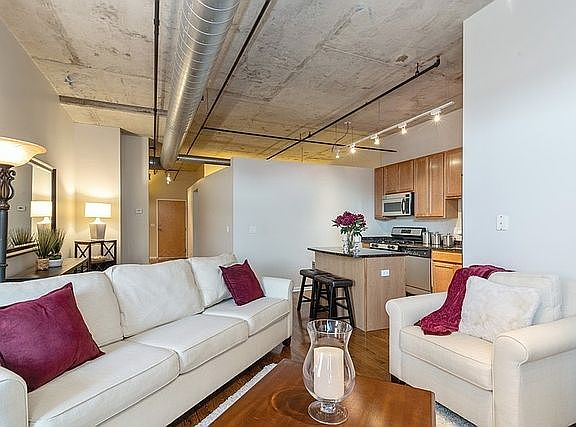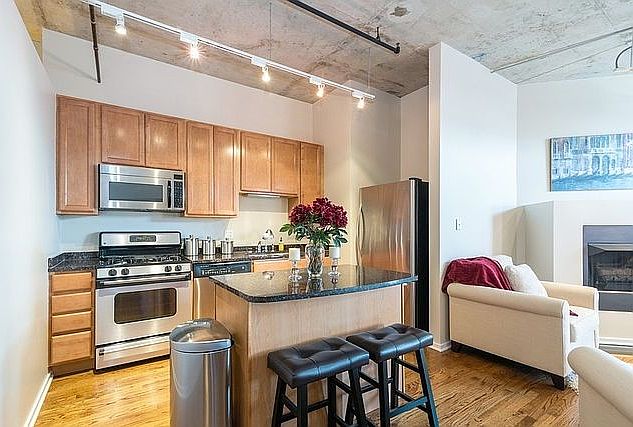Stylish and highly upgraded 1 bedroom penthouse condo in HOT WEST LOOP! This impeccably kept home offers 10' ceilings, dark hardwood floors living areas, 42" maple kitchen cabinets, stainless steel appliances, granite countertops & large island w/ breakfast bar perfect for entertaining! Kitchen and combined living room create fantastic great room including gas fireplace! Adjacent private balcony offers sunset views. Large natural stone bath, granite countertop, upgraded fixtures, & custom lighting. Convenient garage parking p4-48 included! Storage locker included. Popular doorman building steps to the new Michelle Obama $4M park, dog parks, restaurants, transportation, and shopping! Cats ok, dogs under 30 lb considered on case by case basis.