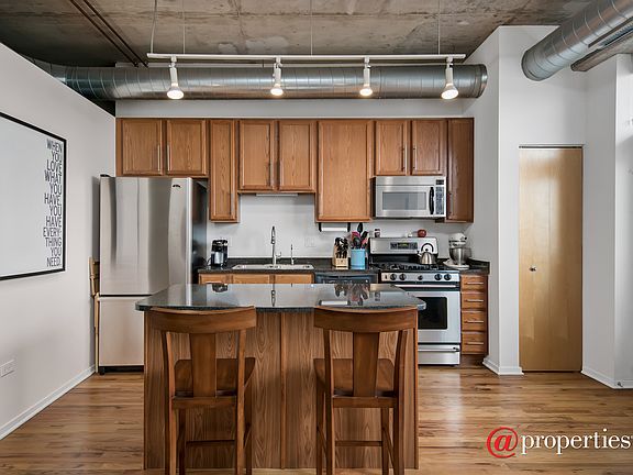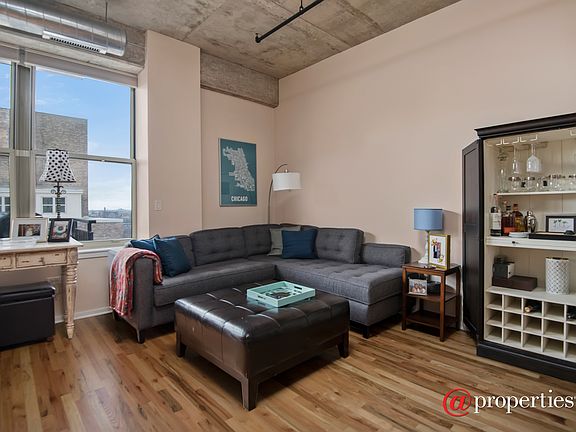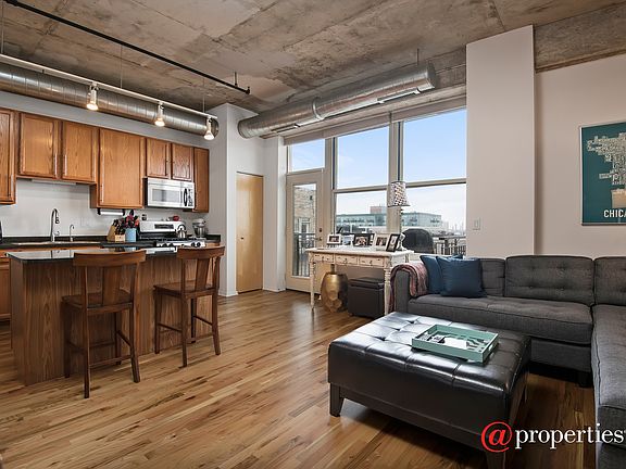 Unbeatable West Loop living in this newer construction loft-style home with a west-facing balcony and garage parking included! Enjoy walking out your door to Skinner Park, Union Park, United Center, any number of restaurants that makes the West Loop so popular, and the El station! All of this close by at a very attractive price. Inside your home, enjoy amazing natural sunlight, hardwood floors, a generously sized living room, & a large bedroom with walk-in closet. The living room opens out to the private balcony that offers west and north views of the city. The kitchen includes stainless steel appliances, granite counters, & a center island with breakfast bar overhang. There is plenty of cabinet space for storing all your cooking items, while the center island offers additional work space. The bedroom is well proportioned and offers a walk-in closet, complete with wood shelving organizers for a well outfitted closet. The bathroom is attached to the bedroom for a master suite set up. Step outside on your balcony and enjoy views of the city and United Center in the distance. Additional features include an in-unit washer and dryer, concrete ceilings, & individual furnace and central air. The assessment includes basic cable, while a garage parking space within the building and storage box are both included in the price. Welcome home to this ideal layout in a perfect & popular location!