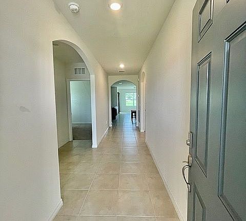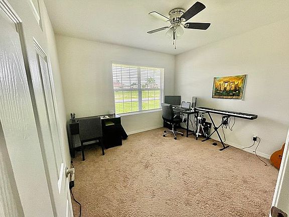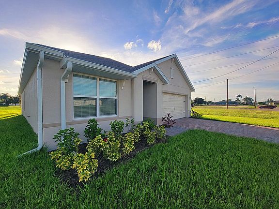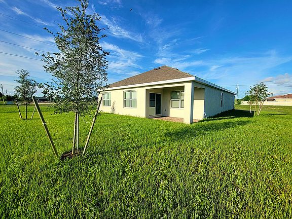 This appealing one-story home includes many contemporary features, and an open-concept design and 8’8" ceilings enhance the wonderful feel of this home. The kitchen includes a large island perfect for bar-style eating or entertaining, a pantry, and plenty of cabinets and counter space. The well-appointed kitchen comes with a built-in dishwasher, electric range, and microwave hood. The dining room and living room both overlook the covered lanai, which is a great area for relaxing and dining al fresco. The large primary suite, located at the back of the home for privacy, can comfortably fit a king size bed, and includes an en suite bathroom with double vanity, walk-in closet, and separate linen closet. At the front of the home, two bedrooms share a second bathroom. The two-car garage connects to the front hallway where the laundry room is located. On city water with all assessments paid. New A/C. Transferable 10 year limited home warranty. Home was finished late December 2020. Plenty of room for a pool! Owner will pay commission if realtor has a qualified buyer. · Open-concept modern new home. · New home just completed in December 2020 · Great Location / Neighbors · City water assessment in and paid for · Two car garage · Archway entryway and transitions · Smart home · ADT Security Alarm System · Ring Doorbell with camera · Hurricane Shutters · Quartz Counters in Kitchen and both bathrooms · 18 inch wall tiles in bathroom · 18 inch tile in common areas · Carpeted rooms · Linen Closet in master bath and second bathroom · Dual sink in master bathroom · Irrigation System . Transferable 10 year limited home warranty.