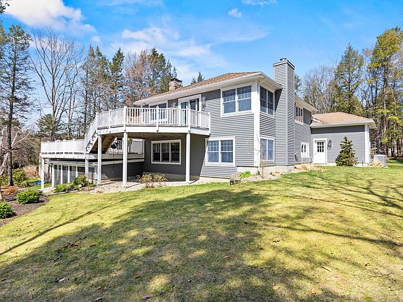 Exceptional Dale Bragg custom multi-level 4 bedroom home with a 2.5 car garage on the 5th hole of the Falmouth Country Club. The beautifully remodeled home is built with some of the finest finishes and modern conveniences. The grand vaulted entry with herringbone tile floors leads into the mudroom to the left and the newly remodeled custom kitchen to the right. The kitchen features solid stone counters, a large island, a Bertuzzoni range, a bar fridge, many cabinet upgrades and a large eat-in breakfast booth. The spacious open floor plan includes soaring cathedral ceilings in the dining and living rooms with access to a giant deck overlooking the 5th hole. The upper level features a dramatic primary suite with french door entry, a fully remodeled bath with a gorgeous soaking tub, new flooring, a gas fireplace, and blackout blinds. The home office with ample built in cabinets sits just outside the primary and a large guest room is across the hall. A den, 2 additional bed rooms and a large full bath with an additional soaking tub & walk in shower, complete the main living areas The lower level features a great room, a recreational area with a wet bar, a wine cellar, a laundry room, and another stone fireplace with a wood stove. This area also leads out to a fabulous 2 season screen porch overlooking a well landscaped lot on the edge of the 5th fairway. This incredibly well crafted home has concrete slabs floors with radiant heat on every level and gives the home a very solid and warm feel under foot. The upgrades are plentiful including a new Lutron lighting system that allows for programmable lighting themes throughout the home, a new updated ADP security system, lawn irrigation, a Tesla power charger, new central air unit, a 500 gallon propane tank, nest thermostats, invisible fence, and a new granite counter on the wet bar!