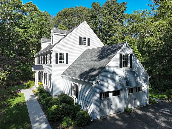 Classic New England Colonial set high on a private cul-de-sac, this 4-bedroom, 2.5-bath home blends timeless elegance with modern updates. A grand staircase leads to generously sized bedrooms, each bathed in natural light with hardwood floors and fresh neutral tones. The master suite features a fireplace and double-sink bath, while the second-floor hall bath also offers dual vanities. Three fireplaces (living, family, and master) add warmth and charm throughout. The spacious eat-in kitchen, formal dining room, and family room with French doors to a patio create ideal spaces for gathering. The finished lower level includes four versatile rooms, including a workshop. A full walk-up attic spans the home, perfect for storage or future expansion. Recent upgrades include new hot water heater, vinyl siding, Harvey windows, a welcoming portico with bluestone walkways, and beautifully maintained crown moldings and built-ins. The level backyard offers mature plantings, woodland views, and serene privacy-enhanced by the elevated setting. Wide neighborhood streets invite peaceful walks, while Mystic, major employers, shops, and conveniences are only minutes away. This distinguished residence is both stately and inviting-a rare blend of privacy, character, and location. Don't miss the chance to make it yours-opportunities like this won't last.