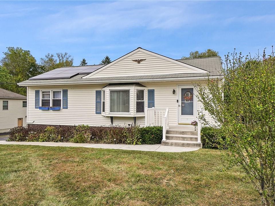 Immaculately maintained 3 bed, 2 bath ranch style home, conveniently located & situated on a manicured, level property backing up to wooded area. Lovely one-level living with bonus space in full walk-out basement. Hardwood flooring in living room, which boasts a large bay window for natural sunlight. Eat-in-Kitchen with plenty of cabinet space, leads out to bright & airy enclosed porch, perfect for dining while overlooking the spacious backyard & two-tiered deck, attached to above ground pool. Underneath deck is a large storage area for tools & lawn equipment. Home is incredibly efficient, featuring central air, attic fan, & solar panels (leased) to offset utility costs. Beautiful, mature wildflower garden in the front, requiring minimal maintenance and providing seasonal splashes of color. Natural gas, public water & sewer. Home is set back from the road, with a long driveway providing plenty of parking for guests. No repairs needed, this home is move-in-ready & will not last!