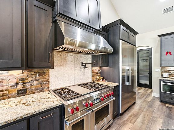 Luxurious Move-In Ready John Merritt Custom Home! Single Story 4BR+Office/3.5BA/3GA, 2884 SF per Appraisal, Stunning Heated Pool & Spa Built in 2021 with Waterfalls, Specialty Lighting, Travertine Tile and Rock Wall Surround sits on an Oak-Studded 1.04 Acre Lot in the 2026 Parade of Homes Neighborhood of Stone Creek Ranch Awaits the most Discerning of Buyers. Built with Thoughtfully Considered Details to Provide Comfort and Convenience with Understated Texas Style Elegance. Unique Opportunity to Own the Smallest Home with a Pool and at the Lowest Price Available in the Neighborhood! Lucky You! The Gourmet Kitchen features a Wolf Range with 6 Gas Burners, Griddle & Pot-Filler, 2 Ovens, Drawer Microwave, Wine Chiller, Under Counter Ice Maker and Miele Commercial-Sized Luxury Refrigerator. Custom Cabinetry & Plantation Shutters Throughout. The Leathered Granite Counter Island with Sitting Area featuring Chiseled Apron-Front Sink will become your favorite Gathering Spot. Welcome Guests to the Warmth of Your Home through the Rustic Wood Door with Seville Speakeasy and step into the Grand Foyer with Barreled Wood Ceiling and Oil-Rubbed Bronze Orb Chandelier. Gorgeous Open Concept Grand Living Room with Vaulted Ceiling with Wood Beams, Wood-Burning Fireplace with Gas Starter features Stone Hearth & Detailing plus Built-In Shelving & Cabinets. Oversized Glass Sliding Doors Overlook your Spacious Covered Patio with Vaulted Wood Ceiling, Traeger Grill & Expansive Concrete Counter, Pool & Spa is Nestled Below the Upper Terrace Providing Unique Privacy, and the Backyard Oasis has been Newly Enhanced with Sage & Mexican Bird of Paradise Plantings. Split Primary Bedroom Arrangement Provides Privacy and Space for All. Primary Suite features Sliding Glass Door to the Pool, Separate Walk-In Closets, Dual Vanities one w/Sitting Area and Tiled Shower. The Office Features a Barn Door for Privacy, Built-In Shelving & Desk and Expansive Windows. Storage is Plentiful in the Walk-In Pantry and Laundry Room. The Outstanding Community Clubhouse Features a Billiard Room & Bar, Huge Kitchen, Vaulted Ceiling Great Room w/Wall of Windows, Wraparound Porch, Gym, Showers, Lazy River Pool, Swings & Playground. Welcome to the Next Stage of Your Life!