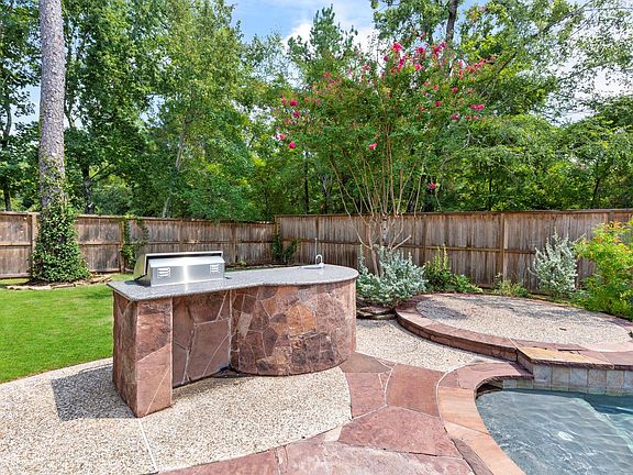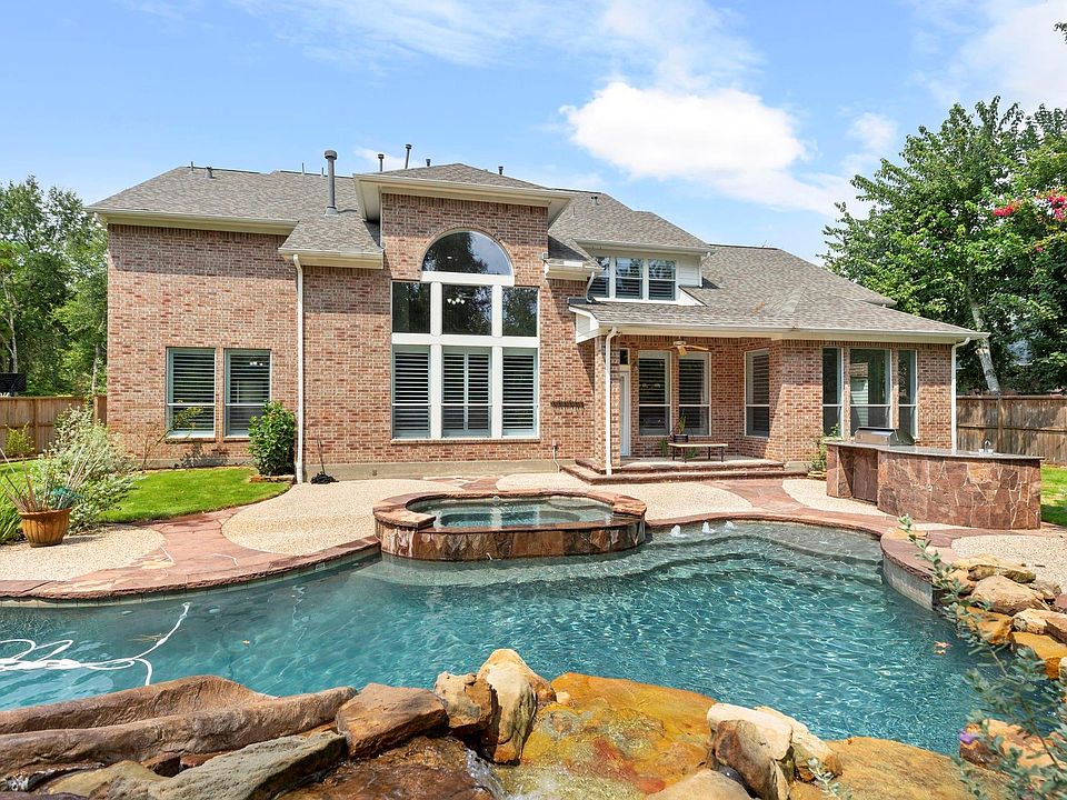 Welcome to this exquisite 5-bedroom, 3.5-bath residence nestled in one of The Woodlands' most prestigious neighborhoods. Elegant plantation shutters and gleaming hardwood floors set a refined tone, leading to a dramatic curved staircase beneath soaring ceilings. The living room offers custom built-ins and a gas fireplace, while the gourmet kitchen features double ovens, an island, under-cabinet lighting, a water filtration system, and a butler's pantry. The luxurious primary suite includes a soaking tub, separate shower, dual vanities, and a makeup area. Upstairs, four bedrooms with custom California Closets accompany two full baths and a spacious game room. Outside, lush Zoysia grass surrounds a heated pool with slide and water features, complemented by an outdoor kitchen. Recent updates include a new roof and fresh interior and exterior paint, making this home truly move-in ready.