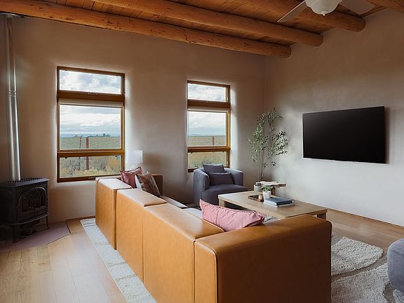 A semi secluded property located north of Taos in the very desirable Upper Las Colonias area. This home sits on a dead end road bordering a Taos Pueblo reservation, which means breathtaking views of undeveloped land and mountains. This property and location are special and provides a peaceful getaway to unwind after a day on the slopes or exploring the region. This home has loads of Southwestern vibes with a whimsical, magic charm that you will energize your soul. The house has a brand new cedar spa in the middle of a beautiful courtyard and comes full furnished with all utilities included! Available to rent month-to-month. Casita on property may be rented out at a later time, but has a privacy wall and space.