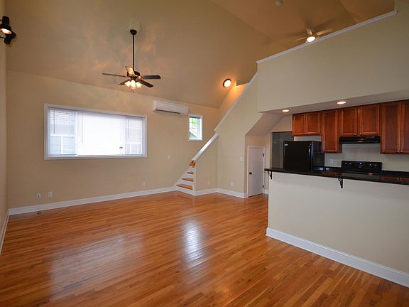 Sweet cottage has super-high vaulted ceilings in the main living, dining and kitchen area, PLUS has a large loft. Lots of big windows keep it light and bright. Bedroom and bathroom on main floor. Hardwood floors throughout home, with ceramic tile in bathroom and laundry area. Granite countertops in kitchen and bathroom; lots of kitchen cabinets. (Small 'neighborhood' with 4 more 'look-alike' cottages in different colors). Very easy commute to either DT Asheville or Black Mountain. Security Deposit: $875. Rent includes water & sewer. Tenant pays for their own power, internet/TV and trash pickup. Enough room for two cars in paved area to left of house; and a separate area for 'company' parking for visitors. NO smoking is allowed in the home or anywhere on the property. NO pets please.