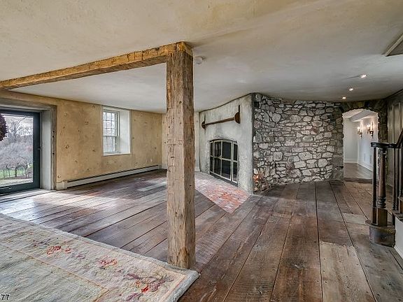 Infused with character and historic appeal, The Cooper House, circa 1736, sits tucked away on a serene cul-de-sac. Set on over five-and-a-half acres of professionally landscaped grounds, the estate boasts a five-bedroom, 4.2-bath home, replete with a fully-appointed guest suite, and two captivating barns that complete the bucolic landscape. The home is adorned with a handsome melding of fieldstone, stucco, and wood shingle, and topped with a slate roof. An original Dutch door entry gives way to the home's Living Room and sets a tone of historic charm. Aesthetically notable details such as deep windowsills, wide board floors, hand hewn beams, and an original stone-cooking fireplace enhance the ornate architecture of the home. A pub room fitted with reclaimed English Oak paneling and an expansive family room with a wall of built-ins offer various areas for both respite and entertaining. A spacious dining room, embellished with a wall of exposed stone, gives way to the main kitchen. Offering both antiquity and modern convenience, the kitchen features a soapstone sink, countertops crafted from marble, butcher block and bluestone, stone flooring with radiant heat, and professional appliances from the likes of Garland and SubZero; the result is a country kitchen fit for today's epicure. The space continues into a Breakfast Room custom fitted with French Boiserie paneling from Pierre Deux and windows that offer a view of the private grounds. A side door opens out onto a picturesque brick terrace and makes for seamless indoor/outdoor entertaining. The second floor of the home features five bedrooms, four full baths, and a sitting room. Replete with original pine flooring and a fireplace with wood mantel and brick hearth, the Master Bedroom is a charming retreat. A Master Bath with a jetted soaking tub, stall shower with tile surround, and recessed lighting complete the room. The living space continues with an exceptional third level accessed via a wrought iron spiral staircase in the upstairs stone gallery. Two storage rooms, a half bath, and an office occupy this floor. A full Guest Suite hosting an additional bedroom and bathroom, an expansive Great Room with cathedral ceiling, wood mantel fireplace, kitchen, and a private entrance and patio, occupies the space over the attached three-car garage. The grounds boast perennial gardens, a small pond, stone walls, and a cobblestone driveway. Two barns-a stone barn with a cedar shake roof and a traditional red barn equipped with a stone floor and two stalls, complete this magnificent property.