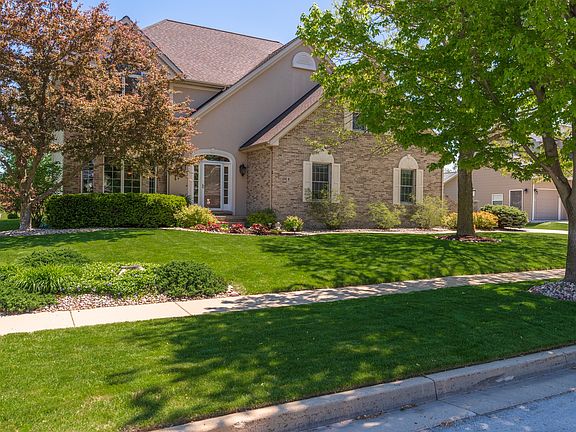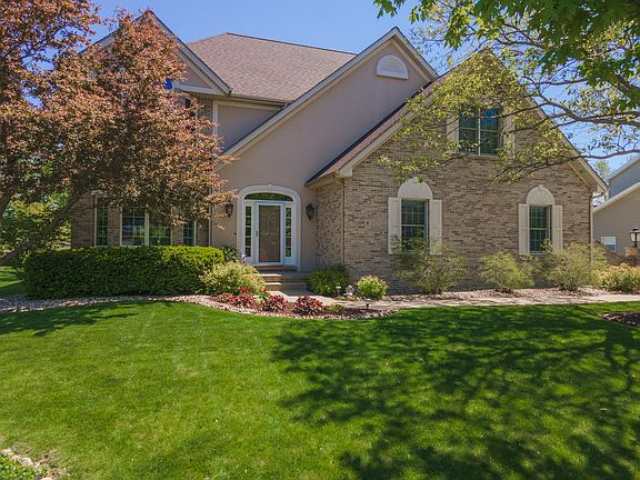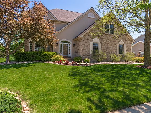 This one has the lot, views, space and updates you have been searching for! Located on a cul-de-sac with views of the signature 5th hole of the Fox Creek Golf Course, this lot measures 100' x 150'. Note the large room sizes throughout. Second floor has 4 bedrooms plus an office and three baths including a Jack-N-Jill, and 2 private baths. The master bath has been totally remodeled with a fabulous and enlarged tile shower, a soaker tub and new vanity, flooring, mirrors, and lighting. Owners have finished the basement and have included a family room with a wet bar as well as a second room for pool or other activities. The main floor has a dream kitchen with a huge island, granite counters and stainless-steel appliances. The kitchen is open to the family room which has new tile around the fireplace as well as built-ins. Enjoy gorgeous views of the golf course and lake from the three decks. The owners have added a sprinkler system to keep the yard looking great throughout the summer. The three car garage also has an additional storage/work space. Here are dates of some improvements - dishwasher and sump pump 2021, roof 2018, master bath remodel 2016, furnace and AC 2014.