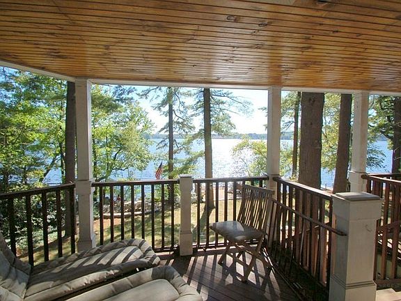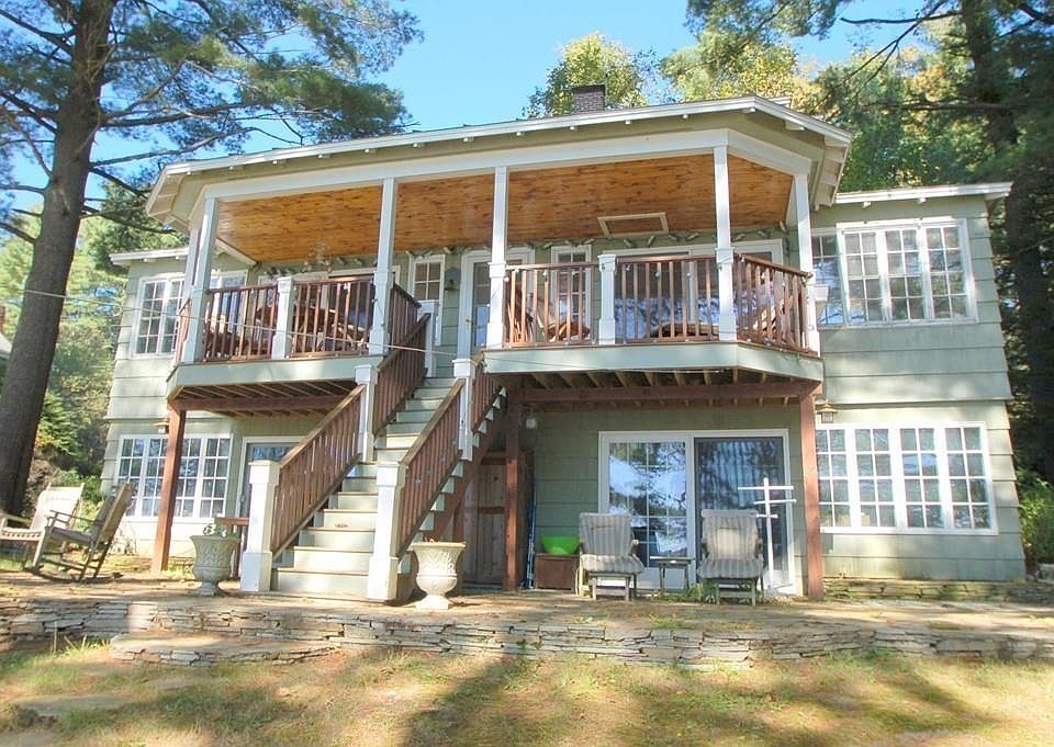 Oh, what a feeling! This open Arts & Crafts-style home has everything you could want in a lake home... charm, character, direct water frontage, spacious open floor plan with amazing water & sunset views, a level wooded lot, located close to all the entertainment you could ask for, including a short drive to public ocean beaches, restaurants, music, and the arts. This home was originally built in 1927 and renovated/raised in 2000. The living and dining rooms open to a 4-season porch that extends the length of the home with walls of windows for spectacular water views. The 4 bedrooms located on the 2nd floor have the charm of a cottage but the amenities of today. Master suite with custom built-in closets & McKenzie-Childs-styled bath. Lower level is a walk-out with double sliding glass doors, family room, office, and gas fireplace. The home has a deck over the patio, another deck right over the lake, and a dock that is included.