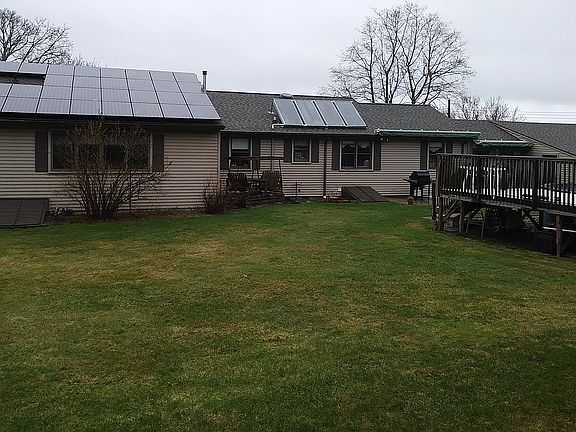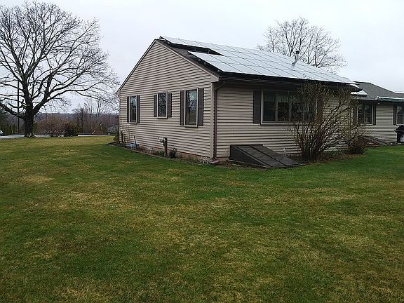 This house looks like a nice small ranch on the end of a cul-de-sac. however this house has over 2000sq ft of living space on first floor. The large heated mud room separates the 3 bay 770 sq ft garage from the house. The washer and dryer are also located in this mudroom. From the Mudroom we move into the open concept kitchen, dining & living room. A 1/2 height wall separates kitchen/breakfast area from dining room, the dining room is open to the living room. A Pellet Stove stove fireplace insert in the Living room easily heats these 3 rooms. A 720 sq ft addition was added in 1996 consisting of Master bedroom suite with private full bath including a whirlpool tub. The Master bedroom has 2 large closets. Plus another good size bedroom with ample closet space. This House has Central A/C, Central vacuum system, irrigation system in front lawn, 6000 watts of solar panels and 4-3'X6' hot water solar panels. Plus the attic insulation has been upgraded to R38 which makes this a highly energy efficient home. The house also has an In-law apartment in basement with full kitchen, full bath and 2 bedrooms and a living room. Besides the pellet stove and solar panels the house has a 5 zone oil FHW system. The detached 30X33 990 sq ft garage is a car enthusiast dream. The garage boosts an 11' ceiling, has 2 post automotive lift, a 4 post post automotive lift, and an air compressor system. To provide a nice warm work shop all winter for hobbies, the building is well insulated and heated with Hot air oil furnace. For extra storage and summer time painting the property has an industrial 30' X 32' tent with Devilbiss cross flow paint booth.. The cul-de-sac location is peaceful and the very private backyard 10' x28' patio which' is covered with Sunsetter awnings. The covered patio's and the 24' above ground pool helps you keep cool on those hot summer days and is great for outdoor entertaining. A nicely manicured front lawn with an irrigation system was recently installed. Finally the roof was recently replaced in 2012 with 50 year architectural shingles. Using the solar panels and 2 pellet stoves makes this home a very comfortable and cost efficient place to live. -- A MUST SEE property. 6 Summit Dr. Key Features: Kitchen has Corian counter top Garbage disposal unit Central Vacuum System Central Air Conditioning Front Lawn irrigation System 23X14 Master Bedroom Suite with Whirlpool tub New roof in 2012 with custom ordered 50 year architectural shingles Anderson Thermopane Windows 1989 & 1996 6000watts of Electric Solar Panels (PV) 4-3'X6' Hot Water Solar Panels which supply Hot water to 80 Gallon Storage tank- this tank feeds 30 gallon tank off boiler 5 Heating Zones Backyard Patio covered with 2 Sunsetter automatic Awnings Super insulated attic including all A/C ducts Pellet Stove insert in Living Room heats front half of house Free standing Pellet Stove in basement heats the master bedroom and front bedroom In-Law apartment in Basement (2 bedrooms, full bath, kitchen & living room) Washer and Dryer hookups on both 1st floor and Basement Detached 30' X 33' Garage with 11' ceiling, insulated and heated with a Forced Hot Air Oil Furnace Garage comes with 7000 lb. automotive 2 Post lift, a 7000 lb. automotive 4 Post lift and 5 hp Air Compressor with 80 gallon tank Industrial 30' X 32' tent with Devilbiss cross flow paint booth ** House is extremely energy efficient using less then 75 Gallons of oil in 12 months and 3 tons of Pellets ** Pellet Stoves have been primary heat source since 2009 **Detached 30' X 33' Garage oil use average approx 100 gallons in 12 months