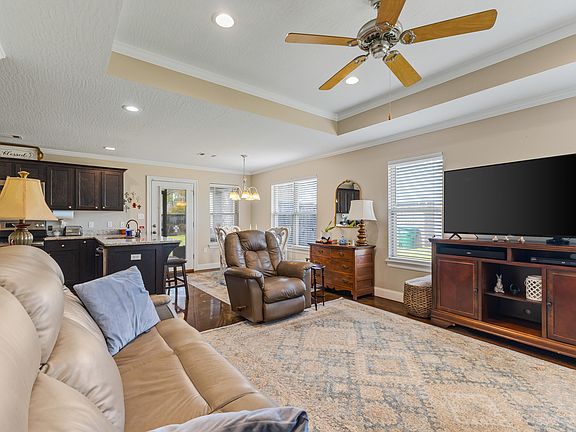 As you enter the home, you'll be greeted by a spacious, light-filled living area with a tray ceiling and beautiful stained concrete floors and finishes throughout. The open concept seamlessly flows into a well-appointed kitchen featuring stainless appliances, plenty of cabinetry, and a large work island--perfect for meal prep or casual dining. The adjoining dining space is ideal for family meals or hosting friends.