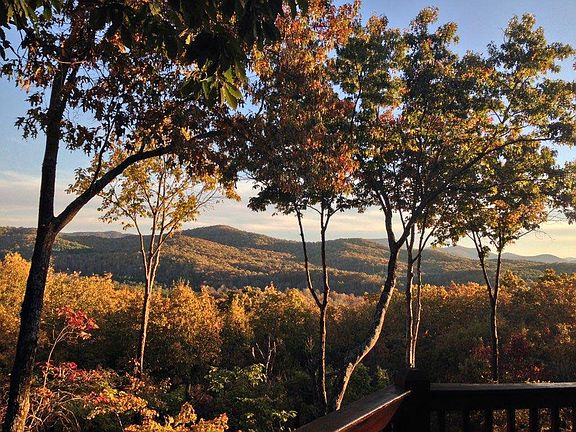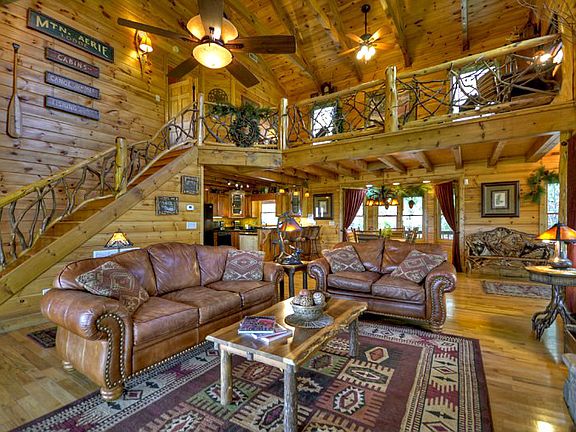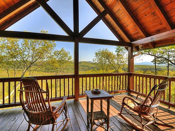 PRIVATE, PRIVATE, PRIVATE - CUSTOM LODGE-STYLE LOG HOME overlooking a long range, multi-layered YEAR ROUND MOUNTAIN VIEW. 3 bd/3.5 bath luxury cabin offers high quality finishes (hand-hewn log details, mtn. laurel handrails, granite, stone & tile shower, etc) FURNISHED w/ High Quality Décor (could be featured in a log home magazine!) Furniture available under separate bill of sale - Can be turn-key with acceptable offer. Open living space and multiple levels of decking for entertaining. 4 stone fireplaces. Full FINISHED TERRACE LEVEL offers game room w/pool table. Covered porch with Hot Tub. EXCELLENT RENTAL HISTORY with future rentals already in place!! EASY PAVED ROAD ACCESS. Add'l acreage available.