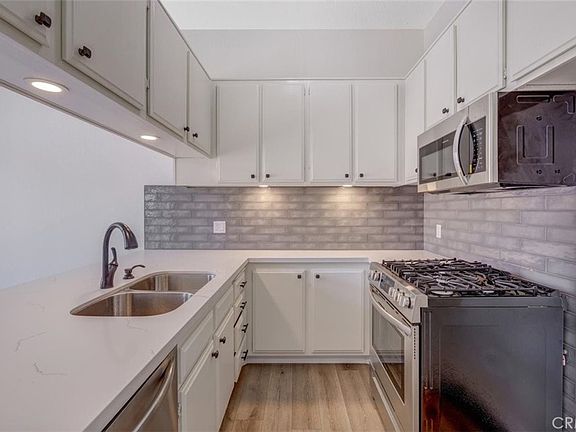 PRICE REDUCED!! This completely remodeled Phillips Ranch condo is Move-In ready!! Over $40,000 in upgrades. New paint and high-end luxury vinyl floors throughout entire unit. 2 brand new bathrooms -- Quartz counters; new mirrors; new lights; new toilets. The master includes a walk-in tiled shower with new tiles and glass door (to be installed). The guest bath includes a new bathtub and tile surround. Kitchen upgrades include new stainless steel appliances, stove, microwave, and dishwasher, quartz countertops and under-the-cabinet lighting. All new interior doors and knobs. New chandeliers in dining room and kitchen; new ceiling fan in master bedroom. Large Lennox air conditioner, only 3 years old. Lots of closet, storage and pantry space. Includes a single car garage and one reserved parking space.