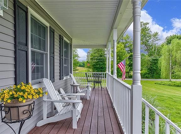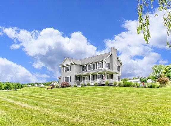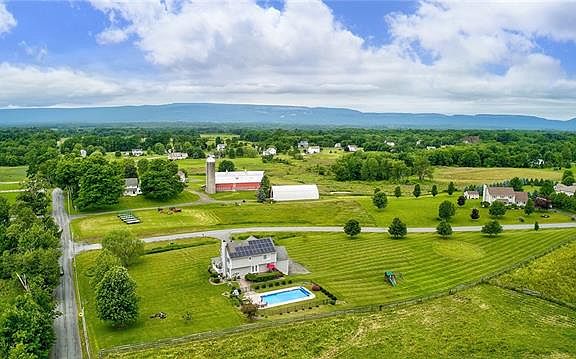 You have never seen a sunset like 6 Trapps View Rd. 4 bdrm 2.5 ba Colonial w/ the most magnificent panoramic views coupled with rolling farm land. Set on 2.29 manicured acres w/ lush landscaping, this home is turn-key. Oversized front porch, foyer w/ beautifully custom designed spaces. Eat-in custom kitchen w/ beautiful cabinets, granite counters, center island & stainless appliances. Spacious formal dining rm for extended family & guests. The living rm has a wood-burning fireplace. The family room has large picture window. The 1st floor also has a bath & rear deck, which overlooks the in-ground pool & side yard w/ large golf practice green. The 2nd fl has three spacious bdrms, full bath w/ tub/shower & a gorgeous master suite w/ en-suite bathroom w/ Jacuzzi tub & standing shower. The basement is partially finished, walks out to the two-car garage, back-up generator hook-up, dog Watch equipped. 1 mile from the Rail Trail, close to New Paltz, Gardiner, NYS Thruway for easy commuting.