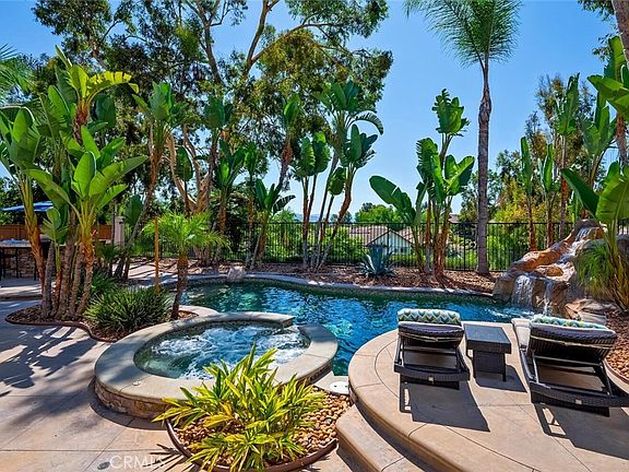 Step outside to your very own tropical paradise, where the oversized backyard becomes an oasis of luxury and leisure. The stunning pool with waterfall, Baja shelf and jacuzzi are surrounded by lush landscaping, creating a serene escape. The built-in BBQ, bar area, fire pit and expansive entertaining area make this space perfect for hosting gatherings with family and friends.