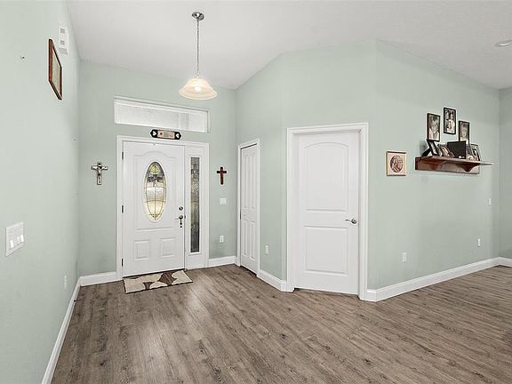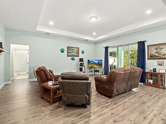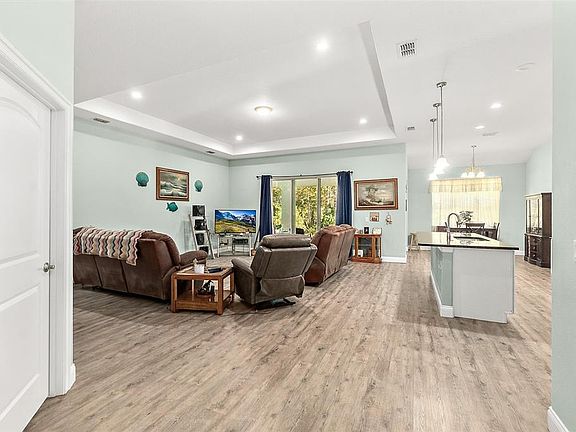 This spacious 5 year old 4 bedroom 2 bath home is located in the Pine Lakes Subdivision. Open concept with living room and kitchen separated by a large kitchen island for entertaining and space for cooking. Living room opens onto the lanai with sliding glass doors to allow lots of light in and your view in the back yard is a beautiful wooded area for privacy. The kitchen boasts a walk in pantry, large refrigerator and that center island is amazing. Master bedroom features lovely 17 x 14 room with tray ceiling and walk in closet and linen closet. Ensuite bathroom is spacious with a large walk in tiled shower and double sink vanity. The 4th bedroom can be used as an office or a bedroom and it has a built in closet for either use. Guest bathroom has a single vanity and a tub with shower head. 10x16 shed in back yard for storage. The house is equipped with solar panels that run the entire house. They will be paid off by seller at closing. This is adds an energy cost savings and more value to the home. Buyer will be able to assume ownership at closing. NO OWNER FINANCING AND NOT AVAILABLE FOR RENT!