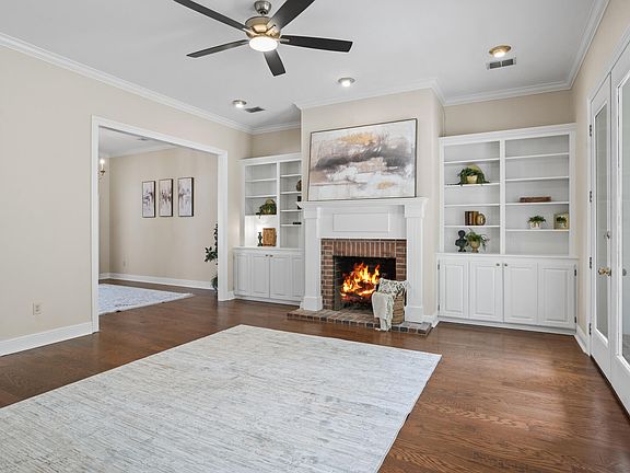 - Description: Wood burning brick fireplace with built ins on each side; new wood flooring.