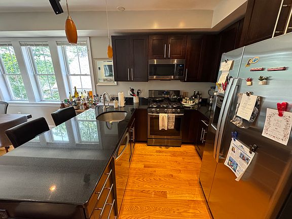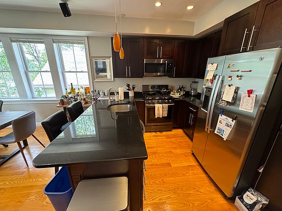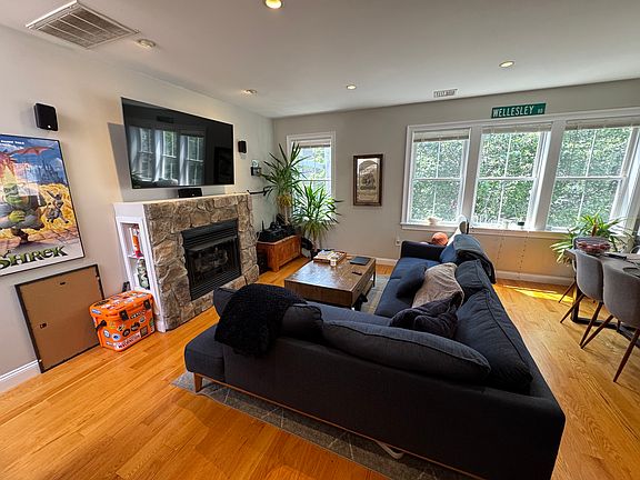 Available September 1st Move in. Welcome to this stunning 2-bedroom, 1-bathroom penthouse condo, ideally located for commuters with easy access to the T station and highway. Enjoy the luxury of two private outdoor spaces, including a spacious private roof deck ideal for relaxing or entertaining. Inside, you'll find an open-concept layout featuring a large living room with a cozy gas fireplace, beautiful hardwood floors throughout, and central HVAC for year-round comfort. The modern kitchen is equipped with stainless steel appliances, a wine cooler, and sleek finishes. Additional conveniences include in-unit laundry and one garage parking space. Tenant to pay utilities.