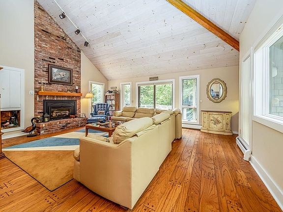 This Eastman gem offers an array of unique features that make it a truly special find! The open-concept great room with vaulted ceiling, beautiful wood floors, and a cozy fireplace create an inviting space perfect for gathering. Step out through the sliding glass doors to the wrap around deck, where you can enjoy the peaceful, wooded lot. The primary bedroom is conveniently located on the main level with an ensuite bathroom and cedar closet. The spiral stairs will take you up to the loft area, which perfect for an office or reading nook with two built in bookcases. On the lower level, you'll find two additional bedrooms, each with a sliding glass door out to the spacious backyard. The lower level also includes a full bath, a game/TV room and plenty of storage space! This exceptional home showcases quality craftsmanship that you do not see in newer homes. Eastman is an intergenerational four-season community with a spectacular lake, miles of hiking trails, tennis courts, pickleball courts, an indoor pool and fitness center. Eastman is also home to a semi-private golf course and Forbes Tavern.
