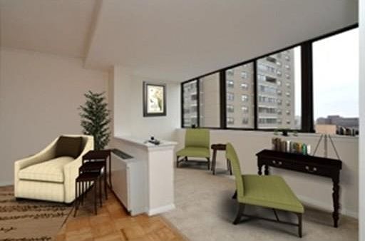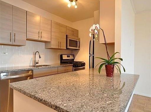 Your wait is over! Glorious River Views! Unique, Spectacular, Renovated River View Large one bedroom. Architectural Digest like kitchen with designer cabinets, stainless steel appliances, large granite dining bar and an amazing tiled floor. Truly, a stunning eclectic design! Entertainment sized living room with a separate space designed for an office, formal dining, or guest area. Lovely good sized bedroom with a wall of closets and also a Panoramic View of the River. Full bathroom accented with grey granite sink, white vanity, Hollywood lights and mirror. White tiles throughout except for exceptional vertical inlay tiles accenting the wall of the tub area. Newly refinished glistening parquet floors throughout. Brushed chrome and uniquely shaped door handles. Superior modern light fixtures. Closets galore! Just bring your furnishings and enjoy the River and Sunset views from your one of a kind home!