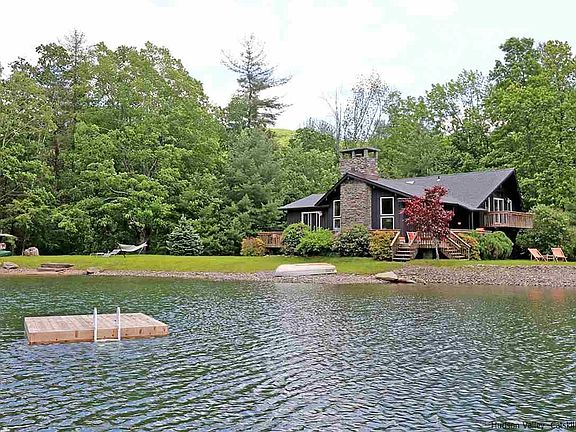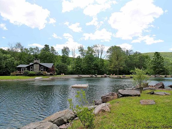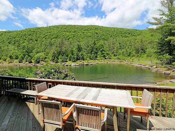 Five minutes from Phoenicia, Mountain Lake House makes Catskill living a dream! Set in a bowl and surrounded by mountain views. Sit beside your own gin-clear mini-lake and feel the tension melt away. Renovated to perfection with brand new warranties on Bosch boiler, Generac whole-house backup generator, intercom-box automatic driveway gate, Mitsubishi ductless air conditioning and a brand new roof""all installed in the last year. Views of the lake and mountains exist from the kitchen, LR, Dining area and the wraparound deck. There's a swimming dock in the specially created 15' deep lake""Let the waterfall trickle over your head after doing some laps? There are two rock-stepped sandy beach water entries! Or, stock the pond and fish for your dinner. The lake is exquisitely landscaped with several varieties of flowering shrubs, spruce and birch trees and hundreds of giant boulders from a recently excavated 1800's stone quarry less than a half mile away! 5 private acres leave you room to roam peacefully. Inside is exquisite...An aromatic cedar clad foyer greets you the moment you step inside the door. Locally sourced hand-cut bluestone floors on the main and lower level game room (family room) have radiant heat. A massive stone fireplace anchors the Great room. Steel beams and vaulted construction marry a lodge feel with modern flair, including clean lines and natural materials. Custom fabricated steel and stone stairways provide terrific flow into and out of the the great room. Custom, hickory kitchen cabinets with soapstone counters, a breakfast bar, 6-burner Wolf stove/hood, Miele dishwasher, trash compactor, and SubZero Fridge make entertaining a snap. Kitchen is just off the dining area""or eat al fresco beside your lake and under the fresh mountain sky. Step downstairs to the game room (family room) where there's an additional wet bar with twin 147-bottle wine storage units, ice maker and beverage refrigerator, all by Sub-Zero; and a Malm fireplace. Plenty of room to play or cozy up for apres ski! Minutes to Hunter, Windham, and Belleayre Ski Centers. Upstairs is adorned by more vaulted wood ceilings and two modern baths. The master has a walk-in closet and stunning views of the mountains and lake from it's own balcony deck. Master en suite suite bath with sunken jacuzzi tub and Toto Neorest toilet with built-in bidet. 3 bedrooms and 2.5 baths on 5 extremely private acres. This has all the wow-factor you can imagine for your country home! The newly drilled well is a gusher, producing over 70 gallons per minute of great-tasting crystal clean water. There's an additional waterside site fully provisioned with electricity and water for your Airstream, beach cabana, or additional guest house. 2.5 hours from NYC and just off the NYC bus line to Phoenicia. A rare find in the Catskills. A pleasure to see and show. These sellers have spared no expense ... and have great taste to boot.