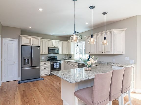 Stunning Craftsman with attention to detail in sought after neighborhood! This young home features all the amenities you are looking for including a covered front porch & spacious open floor plan. Gourmet kitchen has granite counters, beautiful cabinetry & lighting, over-sized dining area with sliders to backyard & opens up to fabulous family room with wood burning fireplace insert. Very large dining room has decorative arches. The 1st floor has a mud room & lav entering from garage. The 2nd floor has 2 good sized bedrooms, hall bath with laundry & spacious primary en suite. The bonus room/4th bedroom is large & features a sitting room/office space. Many rooms freshly painted. Wait until you see the custom lower level - beautifully done, large entertaining space & bar with stacked stone facade. This home still feels like new construction! The almost acre yard has been fenced, with storage shed & wood shed, above ground pool & hot tub. Great location -This one is a must see!
