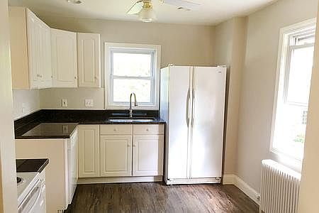 Bright, sunny 3 bedrooms/1 bath single family home with nearly 1200sq ft. of living space, on a large fenced corner lot (4349 sq ft.). First floor has open flow comprised of entrance hall with large closet, living room with fireplace, sunny dining room with custom picture window and two built in corner cabinets. Updated kitchen with electric stove/dishwasher/disposal/fridge and granite counter tops. Additional first floor entrance from side/ back yard via heated sun room perfect for home office. Upstairs find 3 bedrooms with closets and 1 full bath. Hardwood floors throughout. Basement accessed from kitchen offers storage and a washer and dryer and it has a Letter of Deleading Compliance. House is well maintained with newer roof, newer boiler and newer hot water heater. Integral garage protects your car in winter. Go from basement through garage to yard. Driveway parking off garden at rear, but neighborhood offers easy on-street parking. Home is located in West Roxbury's desirable and peaceful Brook Farm neighborhood, off the VFW Parkway between Cory St and LaGrange. Walking distance to West Roxbury's Center St shops and restaurants or Hancock Village amenities on VFW. Easy car access to routes north and south - to the Dedham Mall or to Boston. Near Millennium Park and the Commuter Rail at Highland or West Roxbury Stations. No smoking. This is a lovely single family home in an excellent location. Move in fees of first, security, and 1 month broker fee. Oil heat.