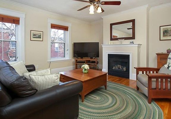 This sunny 2BR/1BA penthouse condo is located in a brick town home on a tree-lined, gas-lit street and features 1,030sf of beautifully finished living space, light from three sides, and multiple skylights throughout. The spacious living room with gas fireplace and crown molding opens to an elegant dining space. The light filled eat-in kitchen features white cabinetry, stainless appliances, including a gas range, granite countertops, a white subway tile backsplash, a skylight and a breakfast nook with bay window. Generous master bedroom with two closets and skylight. A corner exposure second bedroom with built-in bookshelves and closet, and a well-appointed full bathroom with pedestal sink, bathtub with Carrara marble tile surround, skylight, and marble floor complete this rare offering. Large private roof deck with panoramic skyline views of downtown Boston and the Zakim bridge. Amenities include: hardwood floors throughout, in-unit W/D, Nest thermostat, and private basement storage.