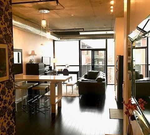 60 Bathurst (Sixty Lofts), Parking And Locker Included! Soaring 10Ft Exposed Concrete Ceilings, Ample Space For A Designated Work Area, Dark Hardwood Throughout With A Huge Walk-In Closet, Ensuite Laundry And Granite Counter Tops In Kitchen Plus Stainless Steel Appliances. Bathroom Has Rain Shower, Light Fixtures Are Newer, Sliding Pocket Doors Into Bathroom And Bedroom. This Stylish Loft Is Comfortable And On A Quiet Floor.