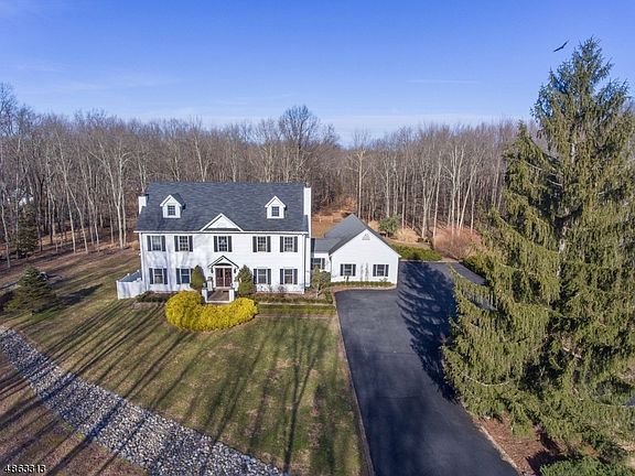Enjoy luxurious and energy efficient country living in this gracious colonial home on 17.7 wooded acres with 3 zone geothermal heating and cooling. From the gently rambling drive, enter through the wood paneled, double front doors into the foyer and dramatic entryway and staircase. Oversized windows, custom wood trim, and hardwood floors throughout create an atmosphere of richness and ensure abundant light. The house boasts two beautiful main floor fireplaces: a gas (propane) fire with granite tile surround in the formal living room and a wood-burning fire in the family room with a craftsman style oak mantle and tile surround. The spacious eat-in kitchen features granite counters, tile backsplash and floors, and a walk-in pantry. Custom maple built ins are featured: plentiful cabinetry, wine rack, custom desk area, and breakfast table. All stainless appliances reign including a Wolf 5 burner stove. The adjacent formal dining room with picture windows overlooks the rear patio and lush back yard. To complete the main floor, a granite tiled powder room and laundry room with sink lead to an enclosed breezeway and connect to the 3 car garage. Plentiful garage cabinets, shelving and large, upper storage area provide wonderful storage space. The second floor opens to an office with custom built in desk and shelving. The spacious master bedroom has a full bath w/tiled shower, walk-in closet, and lovely sitting area beside a wood burning fireplace. This floor finishes with two additional bedrooms and a full bath with tiled shower and soaking tub. The 3rd floor, boasting Brazilian cherry floors, a wall of custom storage closets, built-ins and full bath serves as a beautiful 4th bedroom or studio. The party-ready basement has outside access and ample storage. Entertain elegantly on the breathtaking tiered patio, which overlooks manicured gardens and acres of lush woods. With rich custom finishes, energy efficiency, incredible storage, and a full-house Generac Generator, this beautiful property offers easy access to Rt 202, to New York/ Phila, Lambrtvlle, New Hope,and Delaware Rivr; also Liberty Village,& great Flemington shopping.