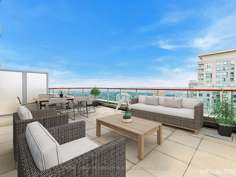 Welcome to this luxury Monarch-built 2 Beds + Den corner condo suite in a prime location with direct access to Scarborough Town Centre, TTC and GO Bus Station, ideal for anyone seeking convenient lifestyle and vibrant community living. Offering over 910 sq ft of interior space with 9ft ceilings, a 350 sq ft oversized terrace, and a wrap-around balcony with sunset views, this bright and spacious unit features plank flooring, quartz kitchen countertop, and is well cared for by the original owner. The den can easily be used as a third bedroom, perfect for growing families. Enjoy being steps to shopping, grocery stores, the public library, and transit, making daily life easy and accessible. One Parking & One Storage Locker Included! 3DVirtual Tour Available (Taken Before Kitchen Countertop Upgraded To Quartz. Please Check Photo For New Countertop).