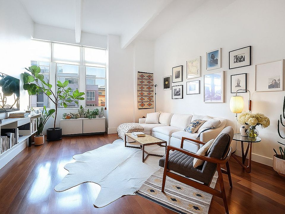 Loft 4Q at 60 Broadway, better known as The Gretsch, is the largest 1-bedroom unit in the building that faces Northwest. The condo offers just under 1,070 square feet of interior space that begs to be filled with large plants and artwork. Any size dining table can fit in front of the large kitchen island, with an oversized V or L shaped couch fitting at the opposite end of the wide open space. The 13 foot high ceilings add to the atmosphere of grandeur. The interior finish is timeless, defined by large factory windows, concrete beams and columns, a kitchen with a Wolf range & hood, and marble bathroom with a deep bathtub and separate glass encased shower.