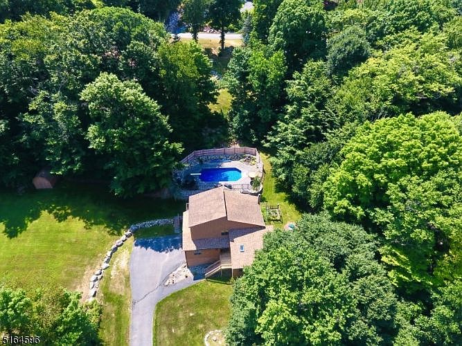 Impressive contemporary on .91 acres of manicured property. Embracing soaring ceilings, natural light filled rooms with plenty of windows, sky lights, and sprawling spaces this home is sure to impress. This move in ready 4BR, 2.1 BA home was built for entertaining. The primary bedroom is conveniently located on the first level, with a walk in closet and full bath. The other three bedrooms, all with plentiful closet space, are located on the second floor for enhanced privacy. The chef-inspired kitchen features granite countertops, tiled backsplash, custom cabinets, SS appliances and a custom built in granite eating area. The centerpiece of the Family Room is a wood burning fireplace that inspires gathering and conversation. The backyard is your own private oasis which includes an In-ground heated pool with a new liner. Unwind next to the custom waterfall with fluorescent rocks that display a beautiful array of colors in the evening under UV light. Rear Deck Flooring all New and ready for an outdoor Barbecue. The private driveway provides ample room for visitor parking. Perfectly situated close to Rt 206 and Rt 80. A quick close is possible. Fireplace as is.