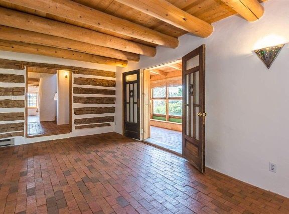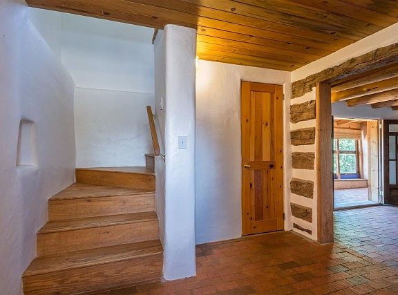 Magical is what this home is all about! Expect the unexpected as you take a walk back in time to when this Storybook Home was built. The Main House, Guesthouse, and Sunroom/Greenhouse incorporate 3 LOG CABINS that are part of the original homestead settled about 1900 in the quaint Northern New Mexico Village of Canada de Los Alamos. This very special property features 3 levels in the 3 bedroom, 2 bath main house with softly curving plaster walls, vigas, nichos, exposed hand hewn logs, Talavera Tile, brick, wood, and flagstone floors, and Mountain Views from every room. Family room opens to lovely flagstone portal and sweet organic garden of abundant fruit trees, established asparagus bed and grape vine. The detached Guest House is cozy, private, and enchanting. This is an amazing and unique property and must be seen to be appreciated. This walk back in time is less than 20 minutes to The Santa Fe Plaza! View Virtual Tour!