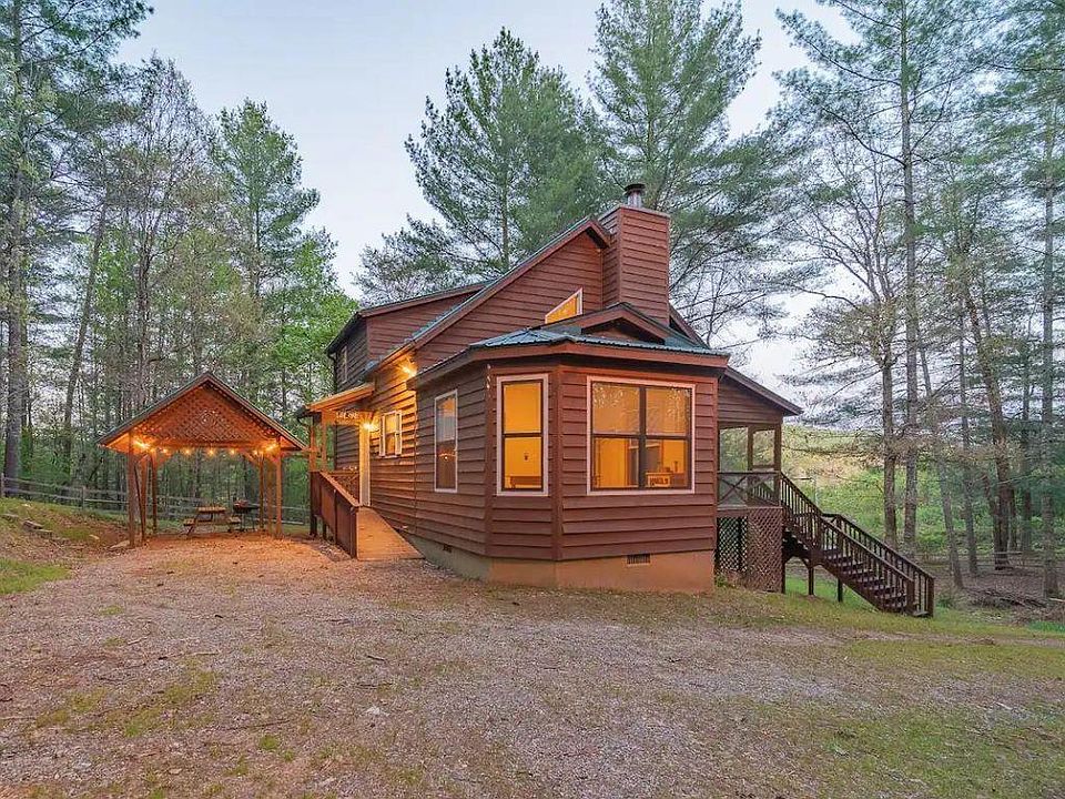 Experience long-range mountain views from this private mountain retreat on 1-acre! As you enter the home, you'll find a great room with a high cathedral ceiling and a grand stone fireplace, along with an open-concept kitchen. Additionally, a separate dining room is flooded with morning sunlight, providing the perfect backdrop for enjoying coffee in this peaceful getaway. A main-level Primary Suite features an authentic cabin feel with wood-beamed ceilings and a private bath. The upper level provides a private guest ensuite. The property is fully fenced with a gated, solar-powered, remote-controlled entrance, allowing your pets to embrace mountain life. Enjoy the refreshing mountain mornings from the screened front porch, which overlooks the front yard. There is an outdoor pavilion and picnic area, with space to build a future fire pit or create a sunny garden spot for homesteading. Recent upgrades include a new HVAC system, fresh paint, and gutter helmets. Perfect home for those seeking privacy or with a proven rental history makes it an ideal secondary home. Just minutes from downtown Blairsville and a quick 15-minute drive to downtown Blue Ridge!