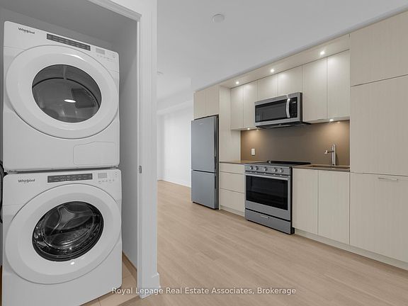 In-suite laundryContemporary kitchenFull-sized stainless steel appliancesSleek cabinetryQuartz countertopsIntegrated dishwasherUnder-cabinet lighting