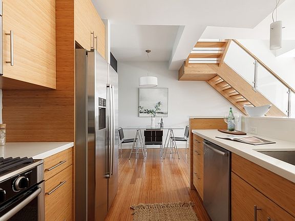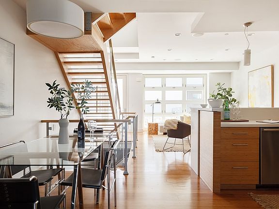 Equally livable and energy efficient, this LEED certified townhouse offers an open concept with bamboo floors and a floating glass staircase. An expansive 2,100-sq ft unit on three living levels, the 2-bed, 3.5-bath home offers comfortable living space. A voluminous living room with 8-foot windows bleeds into a sleek kitchen with Caesarstone counters, S/S appliances and bamboo cabinetry. A rear home office overlooks trees and roof-lines. Ascending upwards, an expansive main suite with private balcony and ensuite bath affords a wall of windows and 13 ft ceilings. This Somerville beauty delivers a fully finished lower-level w/ media room, office, tiled bath, and extra storage. Designed with glass atrium doors that open to a private patio and yard. Set on a sleepy residential street with no through traffic, 60 Clyde is equipped with 1 deeded parking space. Located near the Green Line Extension, bike path and Magoon Sq, this spectacular condo is an ideal urban oasis.