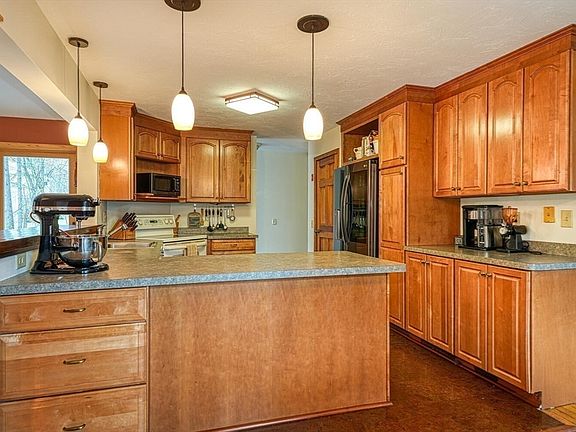 This Cape style home nestled on a wooded lot is a cozy retreat, and having an outdoor space with a built-in fire pit adds a touch of magic. The open floor layout of this home is a dream for entertaining! A spacious kitchen, where cabinets abound for storage, cork-floor, eat-in area overlook the family room with its heated floor and wood-burning fireplace make this an inviting space for everyone to gather and relax. Transitioning to the living room, the charm continues with another wood-burning stove, making this a welcoming atmosphere. A half bath with laundry facilities and an office on the first floor is a thoughtful and practical design choice. Main bedroom w/bathroom, two additional bedrooms and full bath complete the second floor.
