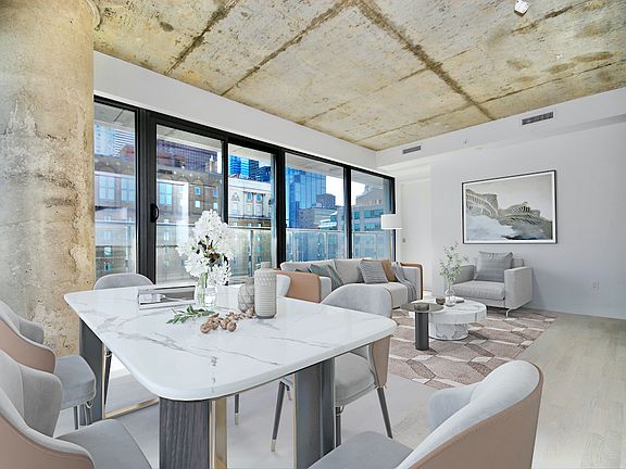 STUNNING corner unit just a 4 minute walk to King Subway Station and St Lawrence market. Incredible south and west views of the city and Toronto Harbour from the condo's large wall to wall windows and the HUGE 298sf wrap around balcony. Grocery store within 300 metres. The primary bedroom comfortably fits a queen bed, has two separate walk-in closets and direct access to the ultra-sleek 3-piece bathroom. The second bedroom also comfortably fits a queen bed, has a double closet and large west facing windows. The unit comes with black out roller shades in the bedrooms and 1% light filtering roller shades in the living & dining rooms. Enjoy cooking in the kitchen, which has a full-size oven, paneled refrigerator, large movable island, dishwasher and loads of storage. This unit also has a high efficiency stacked washer & dryer and a locker. Rooftop pool with an outdoor lounge area, guest suites and 24-hour concierge. PARKING NOT INCLUDED but available privately through other residents. Last month's rent due at signing. 1 year term, tenant responsible for water and hyrdro.