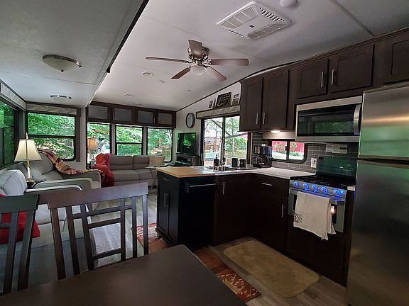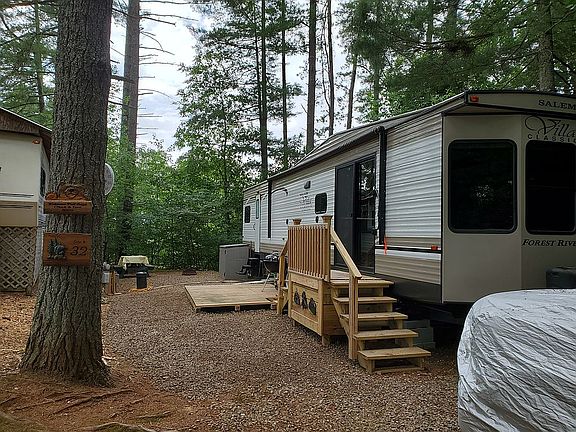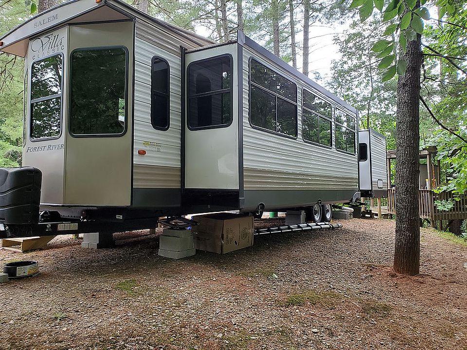 2020 Forest River Salem Villa Classic 40FDEN 42.5 foot long and 9 feet wide, plus slide outs Destination RV Park Model conveniently located in a beautiful wood setting in the foothills of the Great Smoky Mountains in Franklin, NC. Please contact Kaye at Country Woods RV Park for more information: 828-524-4339 Email: cwoodsrv@dnet.net RV offers an open floor plan with 2-slide outs that maximizes the space for a relaxing and comfortable residential cottage in both looks and feel. The panoramic windows and front slide provide great campsite views of this well maintained 55+ retirement community. The RV park offers many amenities such as bath facilities, laundry facilities, library room, observation deck where residents can play games, watch movies or simply relax. There's also a dog park, fire pit and pavilion where the park owner provides several holiday meals during the open season. There are many weekly activities planned all season too. The kitchen is equipped with residential refrigerator and microwave. It also has a ceiling fan, separate pantry, central vacuum cleaner system, and a dining room table with 4 chairs. The bathroom has a walk-in shower with built-in seat, skylight and linen closet. The large king-size bedroom has plenty of storage. The RV has a covered roof that was added last year. Also installed are 2 outdoor fans over the patio area. There's also a large gazebo on the site behind the RV. The RV has a sliding patio door as well as a rear door entrance. All windows and the patio door have room darkening shades that come down as needed. The right side of the RV, with the panoramic windows, overlooks a beautiful wooded area that is not allocated for other use. The park is open from April 1 to October 31 each year. The annual park fee is $2,000 for the lot. Please contact Kaye at Country Woods RV Park for more information: 828-524-4339 Email: cwoodsrv@dnet.net