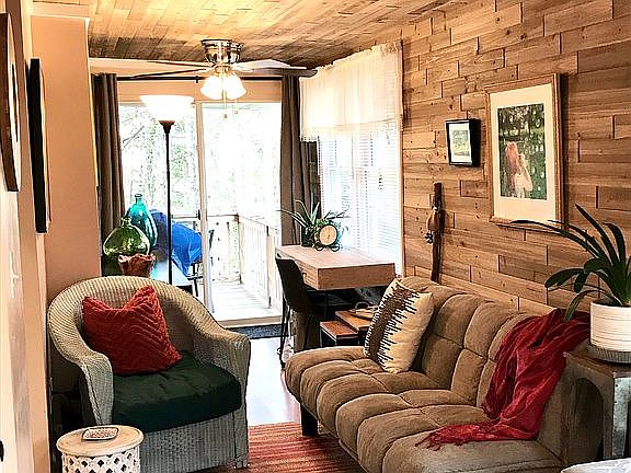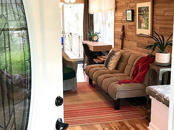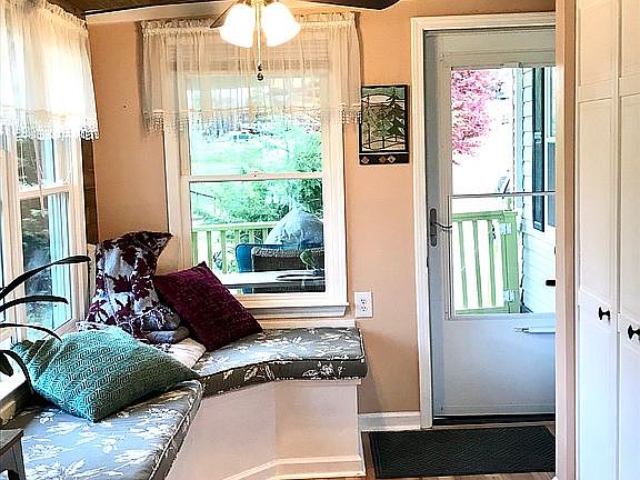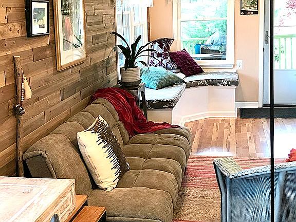 SALE PENDING Lovely park model home located in beautiful natural park setting with a large variety of stately trees, ornamental plants, and abundant bird life year round. This 1996 Sunlight park model home was completely renovated a few years ago with a large room added plus new windows, new front door, modernized ceilings, new kitchen cabinets, granite countertops, updated appliances, added closets, an L-shaped window seat with cedar lined storage underneath, and large tiled walk-in shower. There are beautiful mountain and park views from within and also from two private covered decks, front and back. The floors have been insulated underneath the house and the home holds heat well during the cold season. Two new, quiet window AC units were added last year. There is also a small storage shed, a 4x8 raised vegetable/garden bed, and pretty plantings surrounding the home with small flowering shrubs, perennial flowers and herbs. This home is designed for year round living and is located in a friendly 55+ retirement community offering lots of events and activities during the peak season. Common spaces include a clubhouse with a large viewing deck where many residents enjoy relaxing, visiting, and playing cards and board games. There’s also a large picnic pavilion where the community gathers to celebrate holidays together, a large fire pit, a dog park, bath house, small library, and plenty of space for taking nature walks. Annual lot rent is $2,525 and includes landscape, park, and grounds maintenance. Sale price is $70,000 firm.