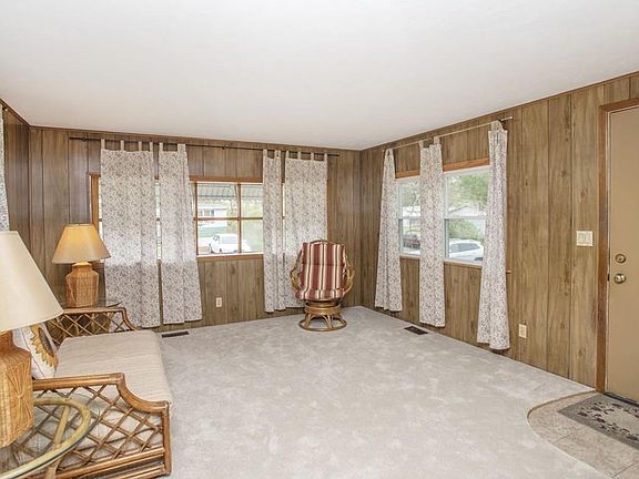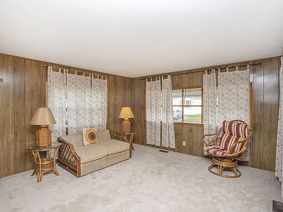 This neat and clean 2 bedroom Marlette home has a lot to offer a new owner for less than $80k. Located in Pine Hill Estates, a 55+ community. Spacious front living room opens to a large eat in kitchen and a breakfast bar with plenty of cabinets. New drywall ceiling thru-out and new carpeting. Original windows (all but 1) were replaced with Harvey windows. Both bedrooms offer built-in drawers for extra storage. Yes, the decor is slightly dated but with a little imagination, this cutie will be a beauty! Come See!